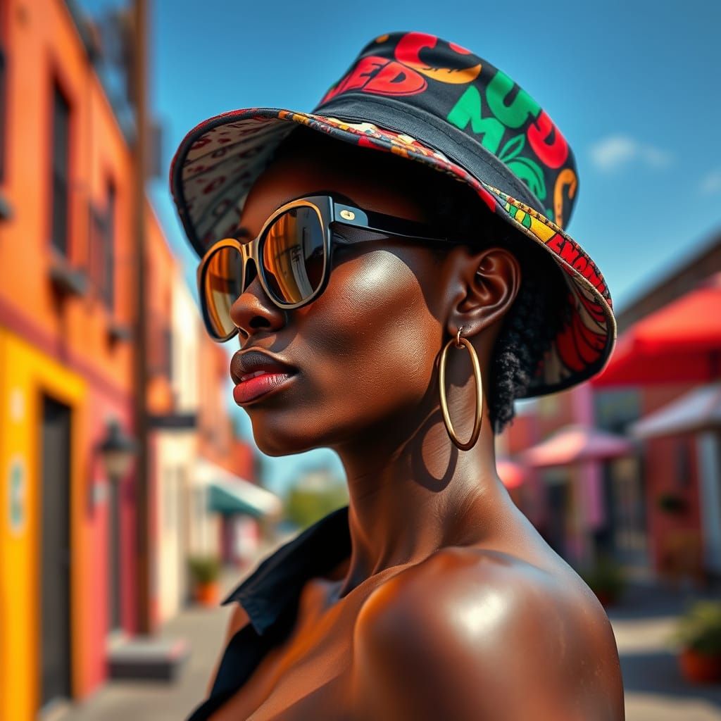 A striking image of a stylish Black woman in a bucket hat and sunglasses. The summer scene is rendered with bold colors, sharp lines, and realistic textures in a photo-realistic style.