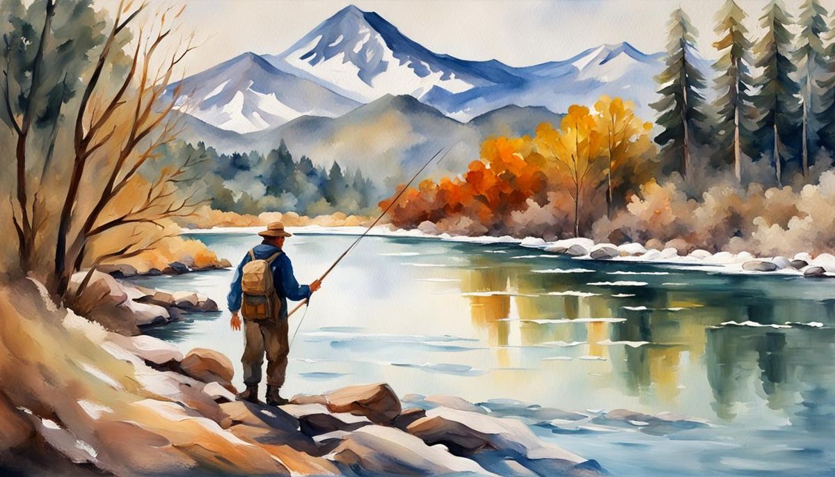 A serene watercolor painting of a lone fisherman on a river, with snow-capped mountains in the background. The artwork is rendered in an impressionistic style using thick brush strokes and impasto techniques.