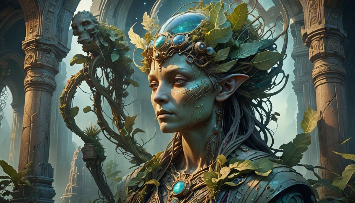 A striking picture of an alien exploring ancient temple ruins. The portrait showcases dynamic lighting, triadic colors, and intricate details reminiscent of Art Nouveau, enhanced by bio-luminescent flora.