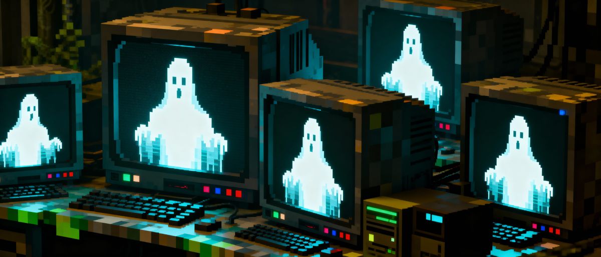 This image depicts a surreal 3D pixel art scene of entities communicating across screens, generating ghostly holograms with a PSX aesthetic. Features otherworldly lighting and unsettling atmospheres.