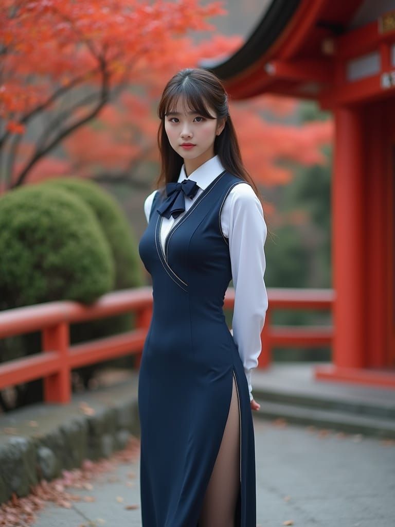 This image captures a shrine maiden posing in a jumper dress before a shrine office in autumn. Cinematic lighting and a dramatic atmosphere enhance the full-body view, highlighting the red leaves.