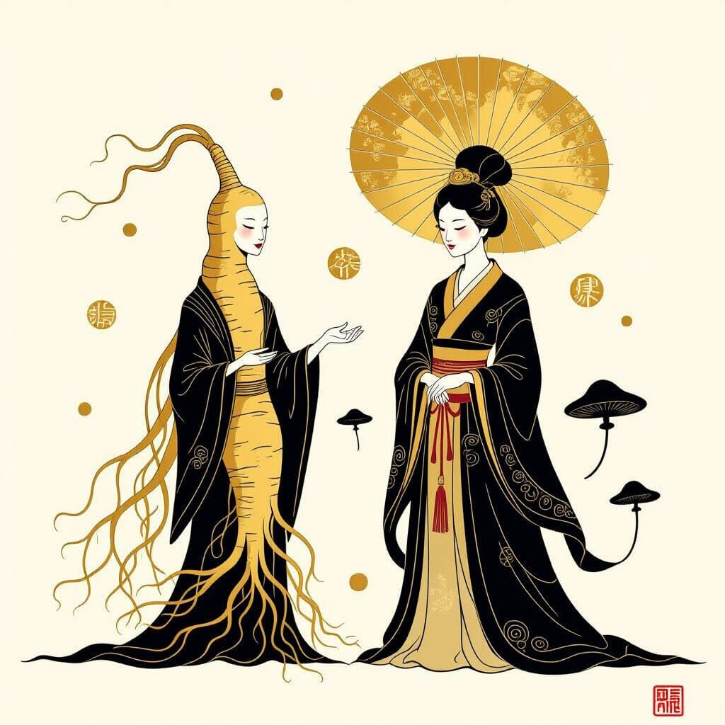 This image showcases anthropomorphic ginseng and lingzhi mushrooms as elegant, sentient beings in a minimalist ink style with gold and black hues. Features stylized brushwork and negative space.