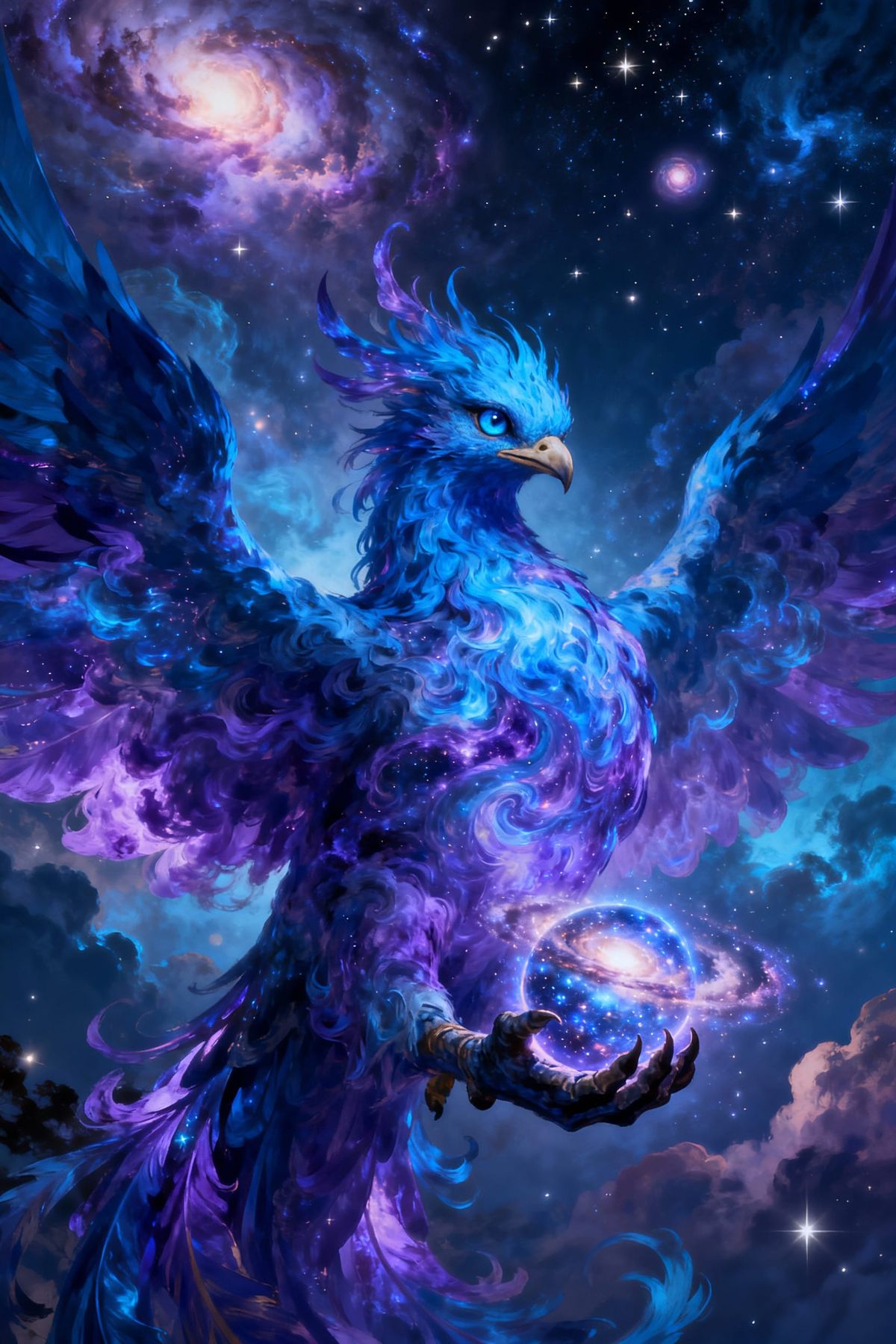 This image shows a phoenix made of swirling blue and purple nebula clouds, holding a galaxy. The celestial creature gazes forward, set against a backdrop of stars and glowing cosmic clouds.