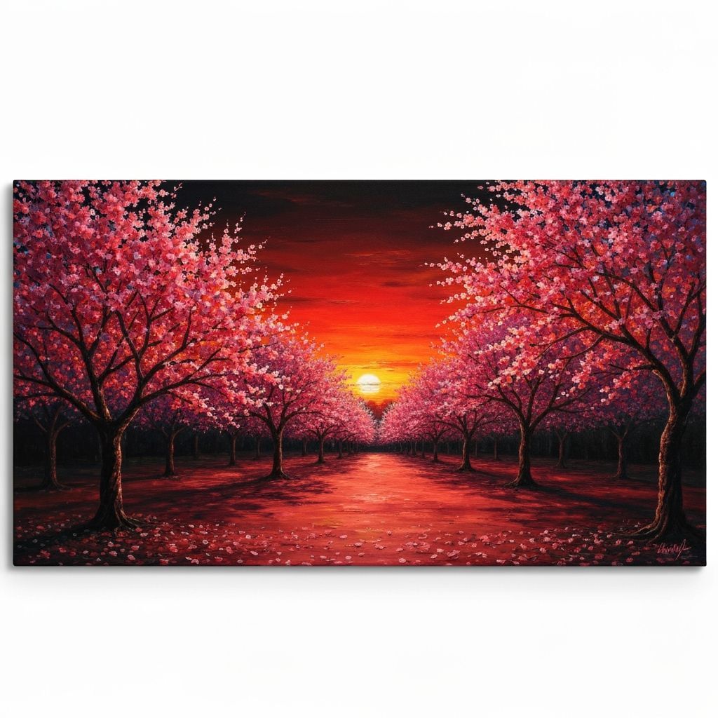 A striking picture of a multilayered Japanese cherry blossom garden in full bloom. The bold colors of red and black contrast against the sunset sky. The artist's oil painting technique creates depth and texture.