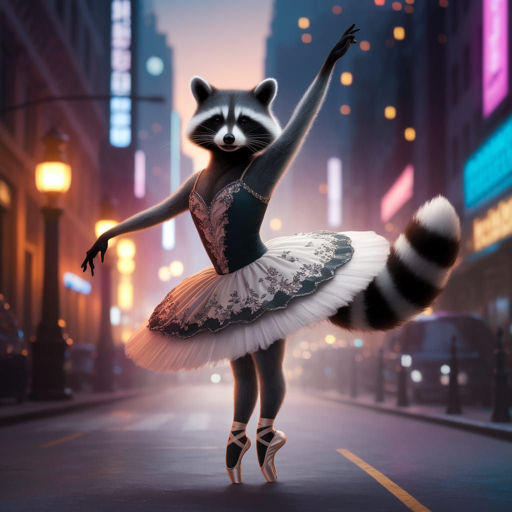 A beautiful image of a raccoon in a ballet costume, performing a pirouette amidst a vibrant cityscape at dusk, with soft streetlights and neon signs creating a magical atmosphere.