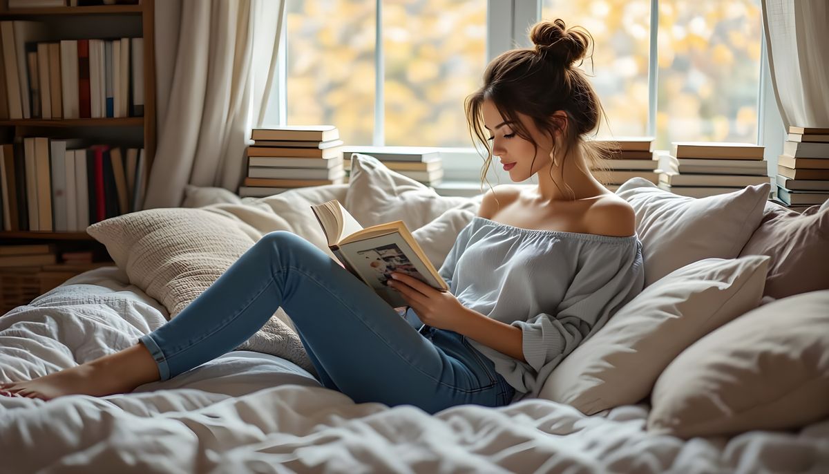 A beautiful Italian woman relaxes in a cozy, book-filled bedroom, bathed in soft afternoon light. Professional photography captures the serene, autumn atmosphere.