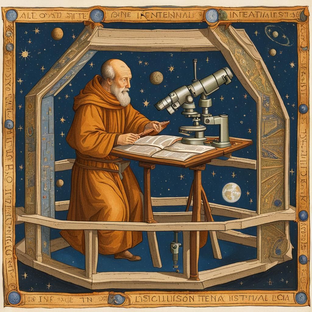 This image depicts a medieval illuminated manuscript illustration of a monk inside the International Space Station, using a microscope in the science pod.