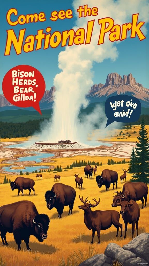 A vibrant travel poster of Yellowstone National Park, circa 1948, showcases Old Faithful and the park's wildlife. The retro design evokes Norman Rockwell and WPA-era posters.