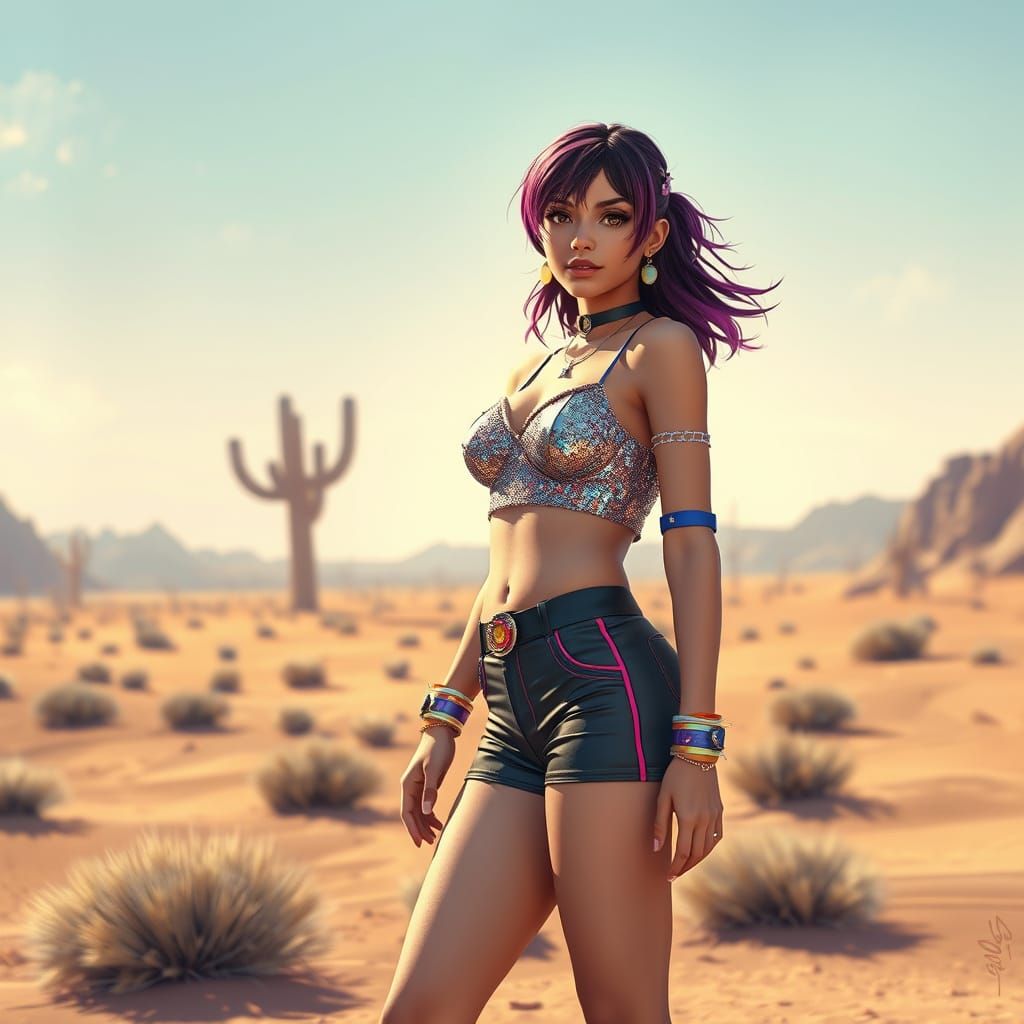 This image shows Sailor Saturn in a glittery Coachella outfit posing in the desert. The artwork is hyperrealistic with vibrant colors and precise details in a futuristic style.