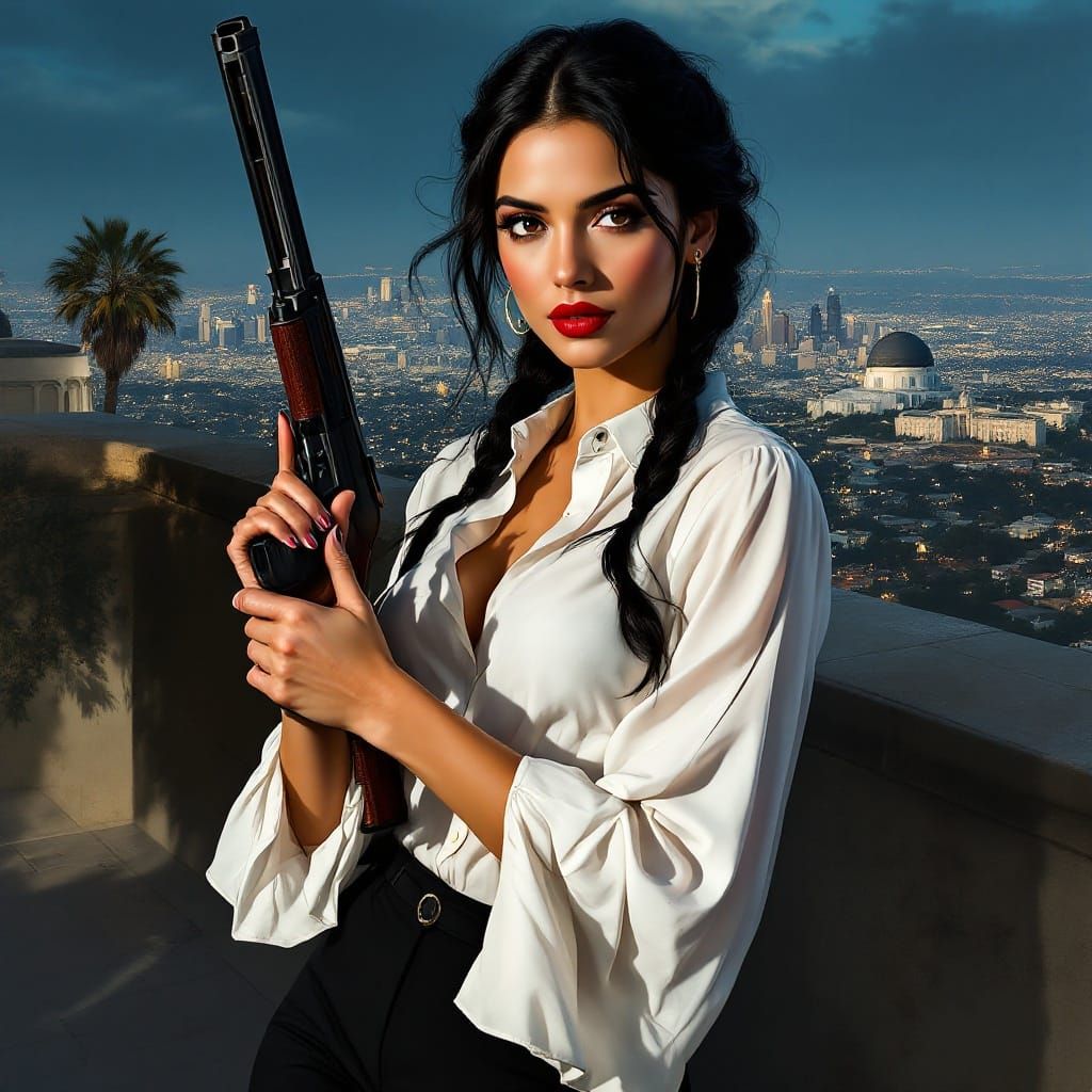 A confident Spanish lady stands proudly at the Griffith Observatory, holding a shotgun and set against the vibrant Los Angeles cityscape, blending the elegance of Spanish Renaissance with the moody lighting of Art Nouveau.