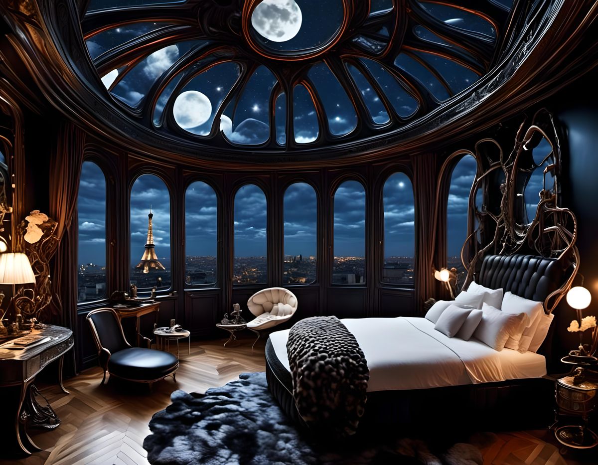 Create your own modern bedroom with a stunning nighttime view using our free AI image generator.