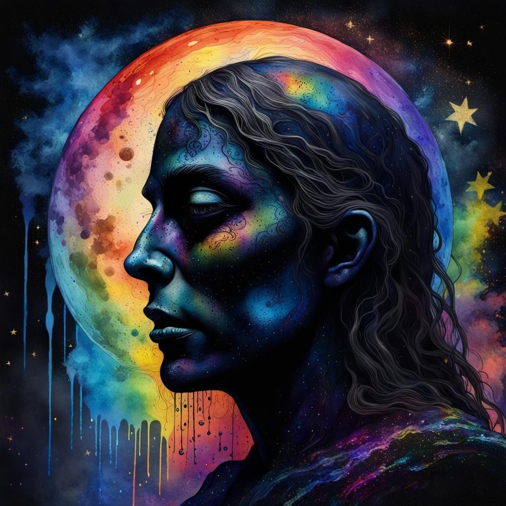 This image shows a dark, ethereal figure against a backdrop of a moonlit sky filled with stars. The artwork features a high contrast color palette and is rendered as an impasto painting.