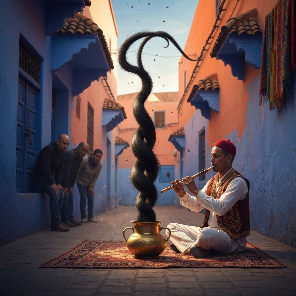 This image shows a street performer in Marrakech coaxing flowing, glossy black hair from a brass pot with a flute. The scene blends magic realism with vivid textures in a photorealistic style.