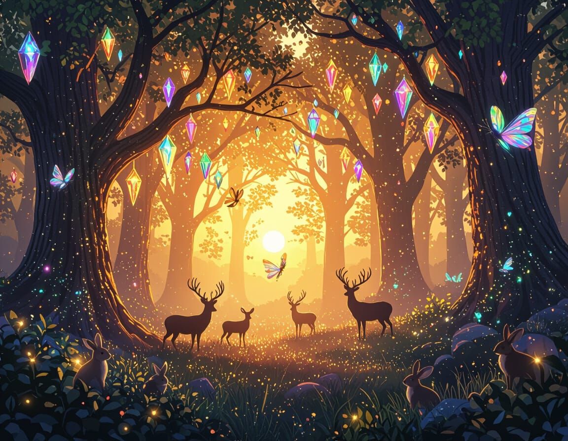 This image shows a vibrant, dreamlike forest scene at sunset. Radiant crystals adorn the trees, and fairies with iridescent wings flutter about, leaving glittering trails in this digital art.