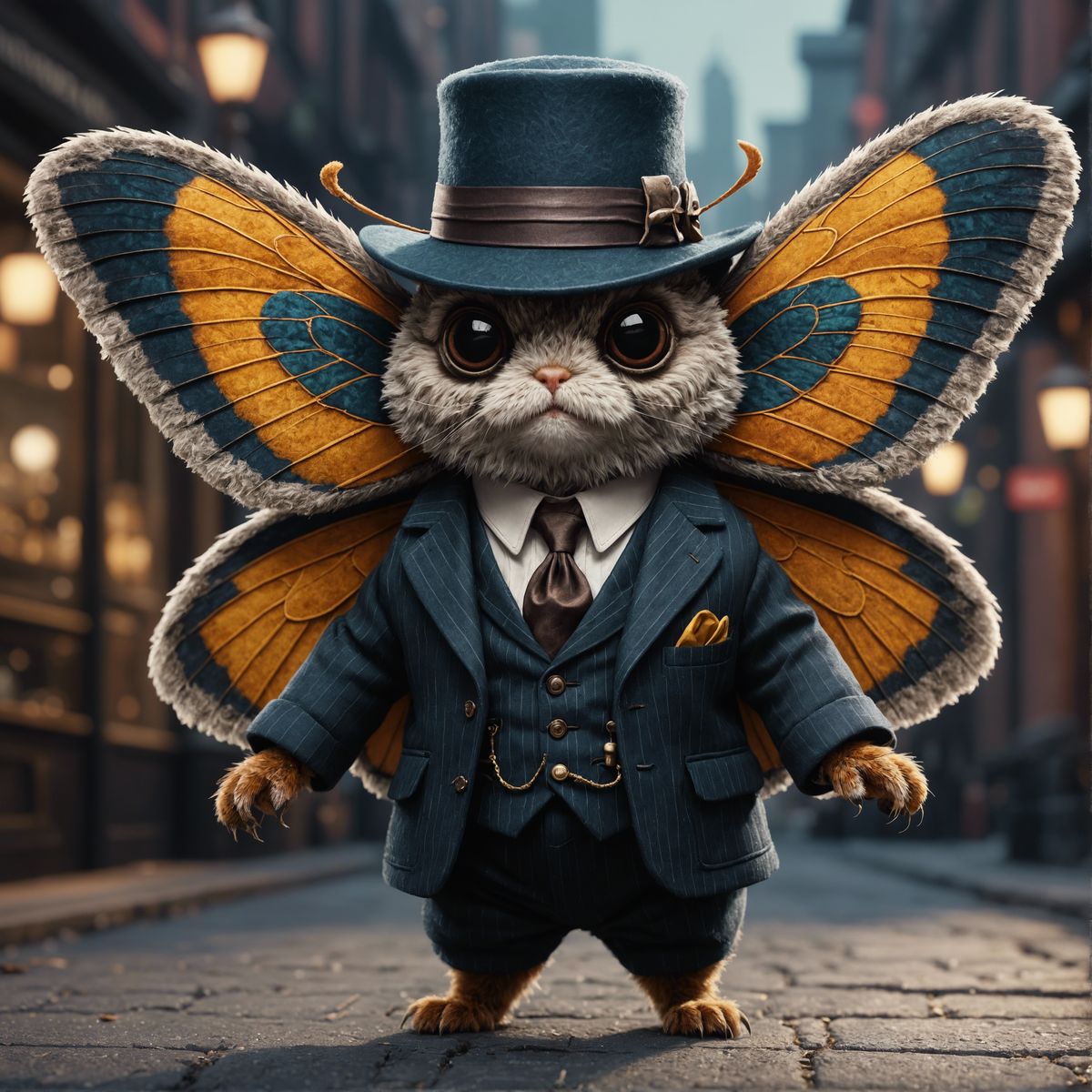 This image shows a fuzzy moth dressed as a 1920s gangster, complete with a suit and hat. The image is a detailed matte painting with deep colors and intricate details.