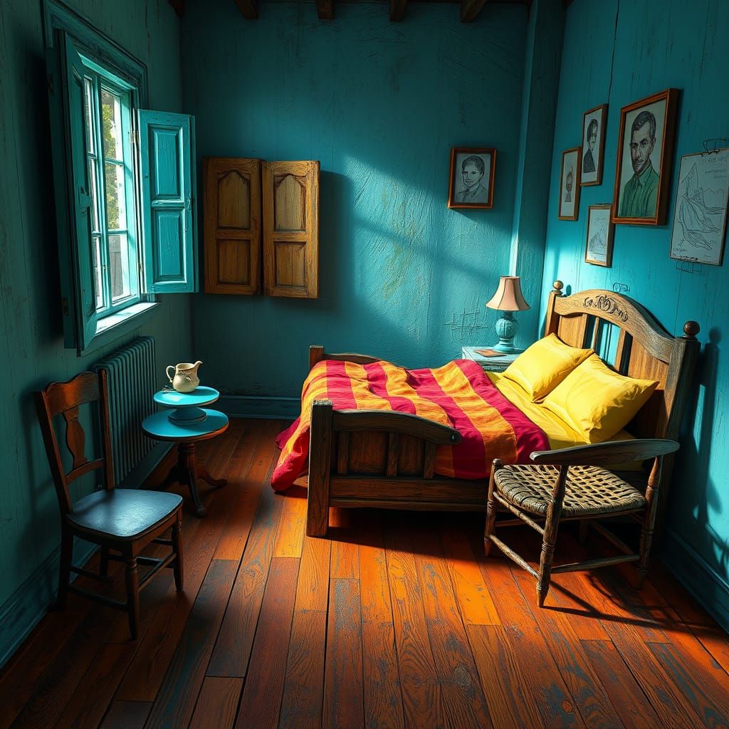 This intimate bedroom scene features bold, expressive colors and textured brushstrokes, blending warmth and coziness with a sense of melancholic solitude. Earthy tones and distressed wood meet soft, cerulean walls, adorned with simple sketches and a weathered wooden bed, creating a dreamlike atmosphere.