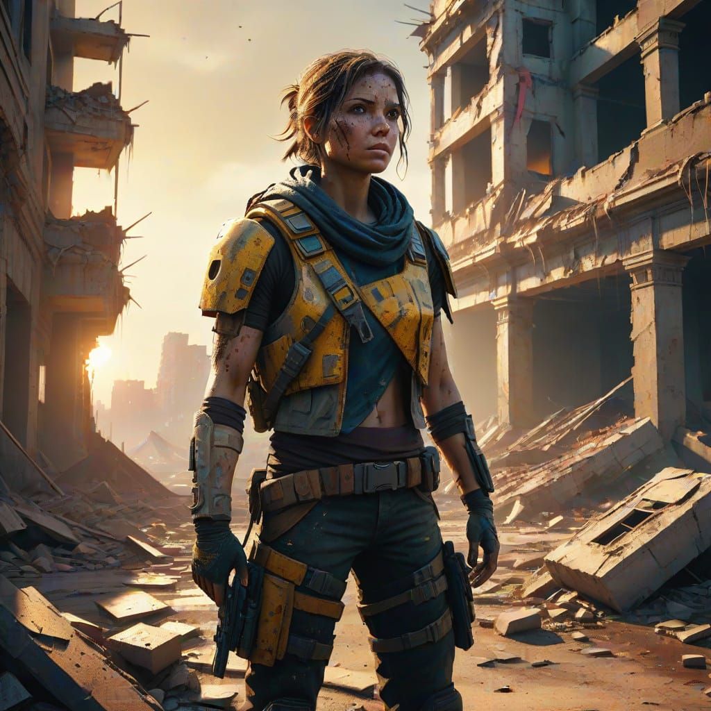 A vibrant digital artwork depicting a survivor in a ruined, post-apocalyptic city. Warm golden light contrasts with deep shadows in this cinematic, highly detailed scene, which is rendered as digital art.