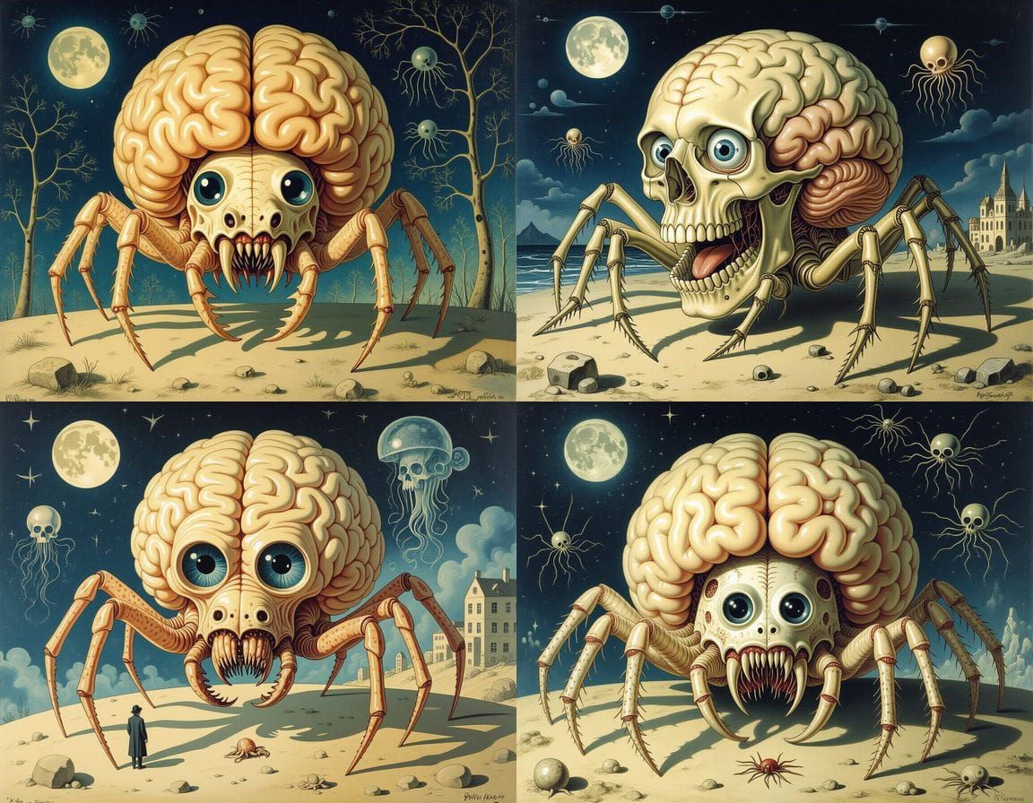 This image depicts a bizarre, surreal creature with a spider brain, bulldog beak, and internal organs, rendered in a detailed monochrome style reminiscent of classical surrealist art.