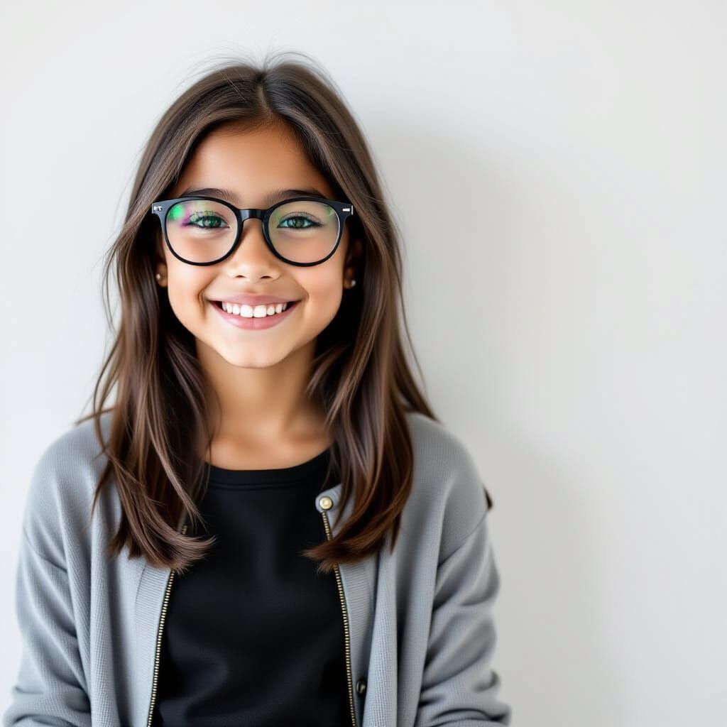 This image shows a realistic portrait of a young girl with straight black hair, dark brown eyes, and glasses. She is casually dressed in jeans and a cardigan.