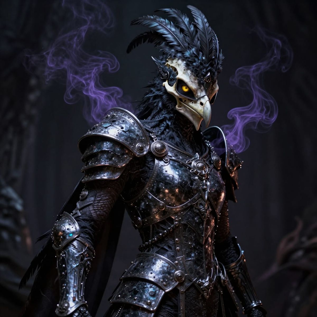 A striking image of a lean, athletic chimera with human and Quiscalus features, emerging from shadows in dark, weathered armor. Features avian bone structure, iridescent feathers, and golden eyes, rendered with dramatic lighting.