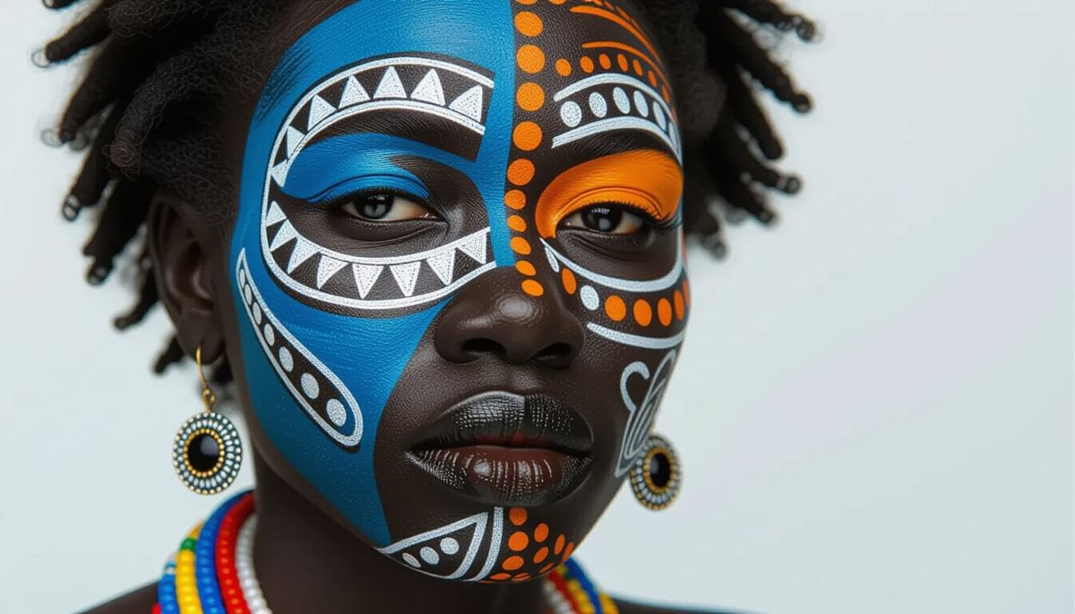A striking picture of an African person with elaborate tribal face paint. The image captures a cultural celebration, with vibrant colors and intricate patterns, including beaded necklaces and earrings.