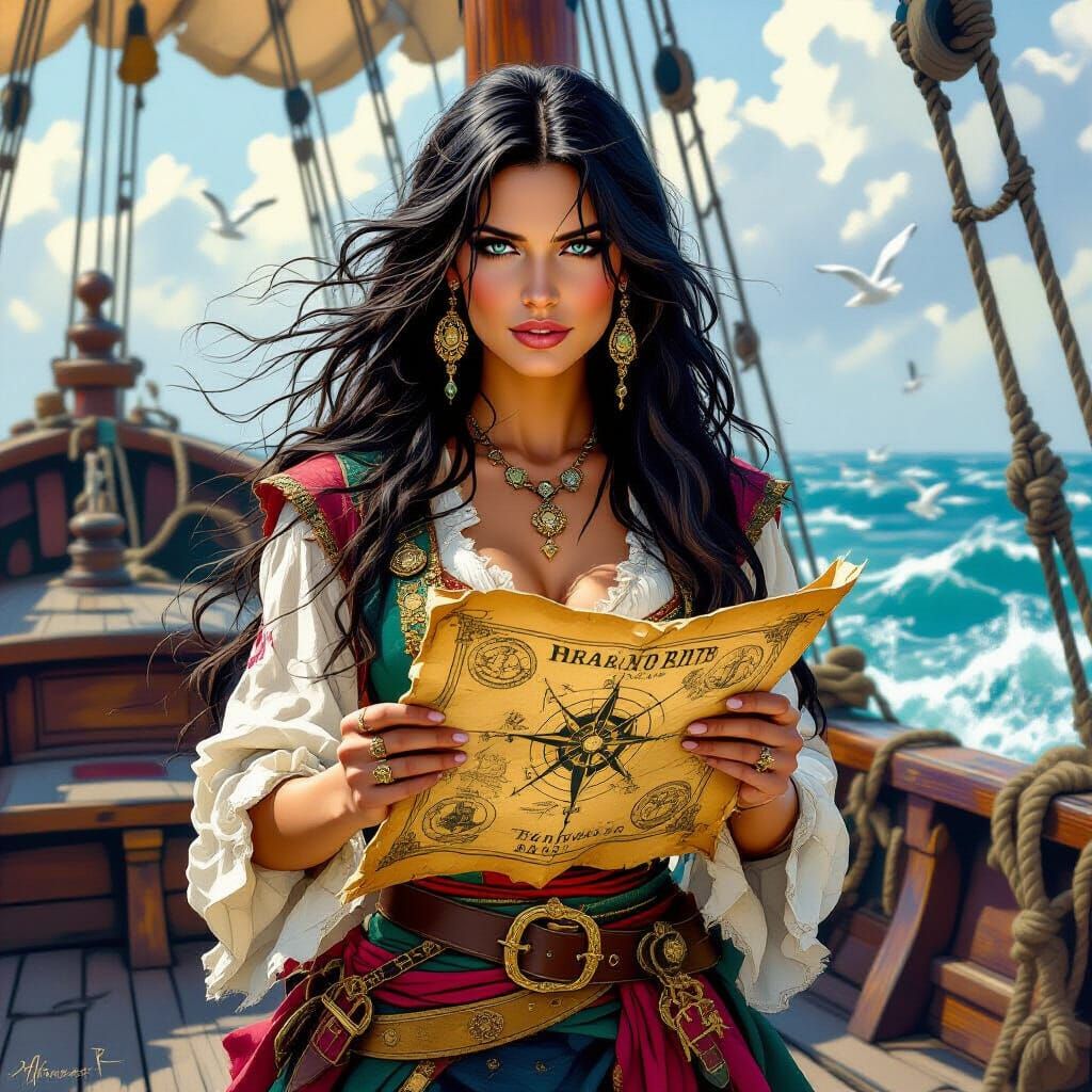 A striking picture of a female pirate on her ship's deck, holding a treasure map. She's dressed in flamboyant gypsy style and the scene is reminiscent of classic pirate adventure paintings.