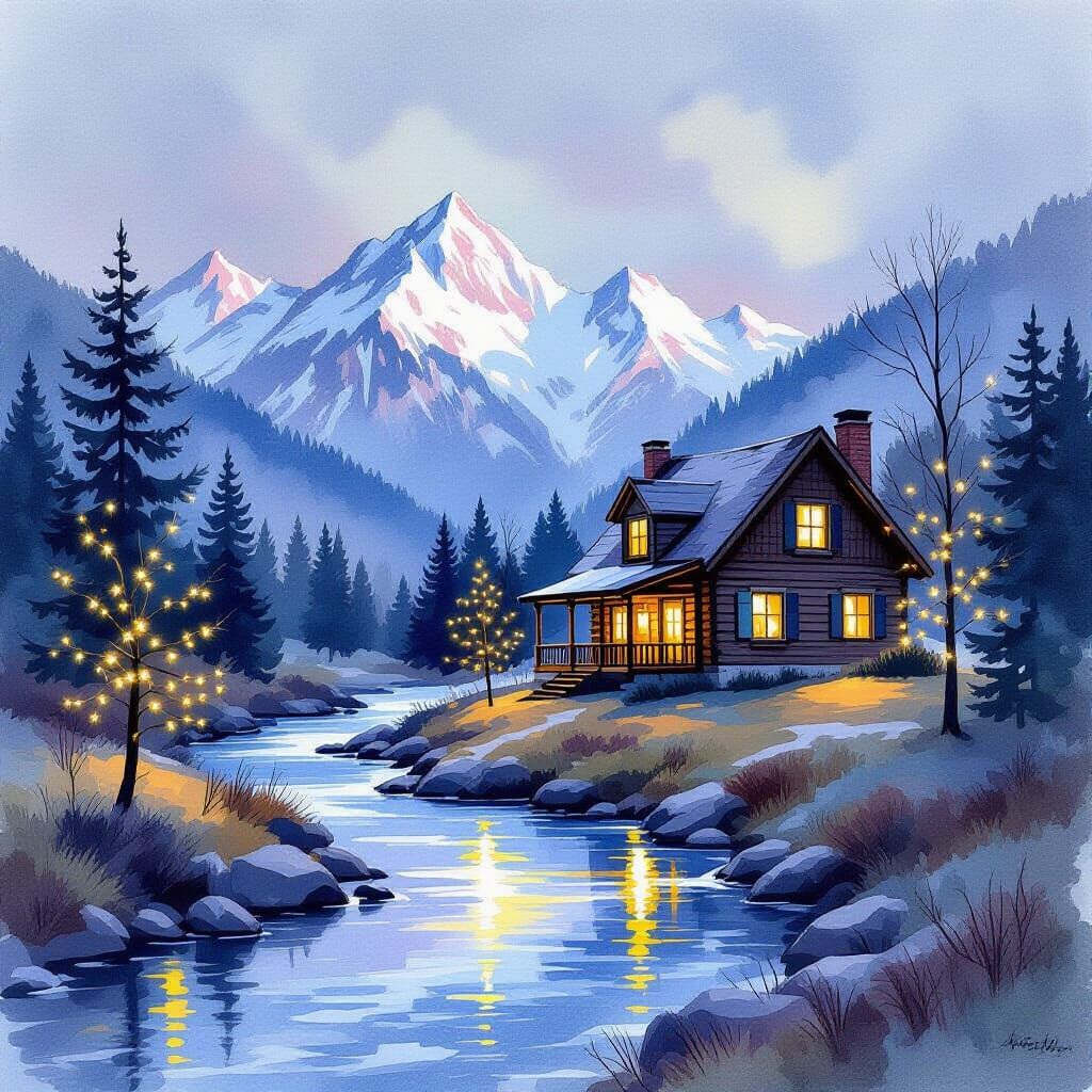 A cozy log cabin beside a snowy stream leading to mountains, illuminated by festive lights. Rendered in a loose watercolor style with textured brushstrokes and soft colors, inspired by atmospheric impressionism.