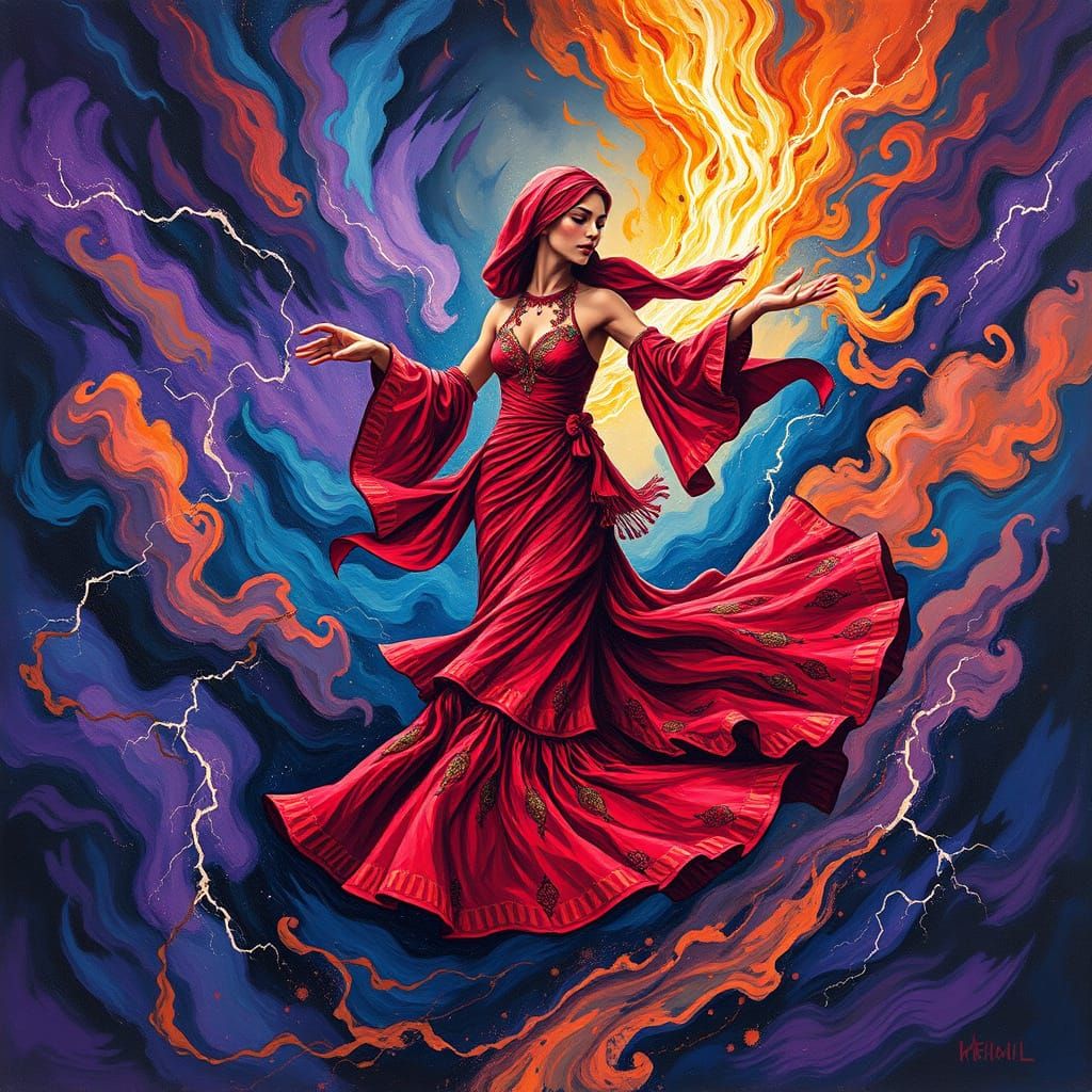 A mesmerizing image of a Gypsy woman dancing in the midst of a storm, surrounded by electrifying lightning and swirling clouds in purple, blue, and orange hues, in a dynamic and expressive style reminiscent of Marc Chagall and Franz Marc.