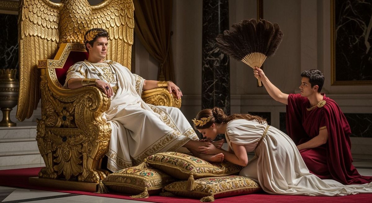 This image depicts a youthful Roman Emperor relaxing on his throne in a lavish palace. Servants attend to him in the gold and white marble setting. The artwork is presented as a sharp, professional photograph.
