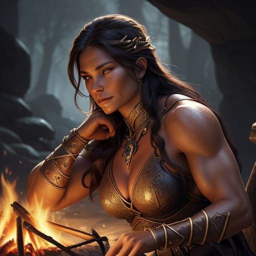 This hyperdetailed fantasy illustration captures a muscular barbarian woman sleeping peacefully by a campfire. Her tanned skin glows with warm firelight, showcasing her serene expression and strong physique in a cozy setting.
