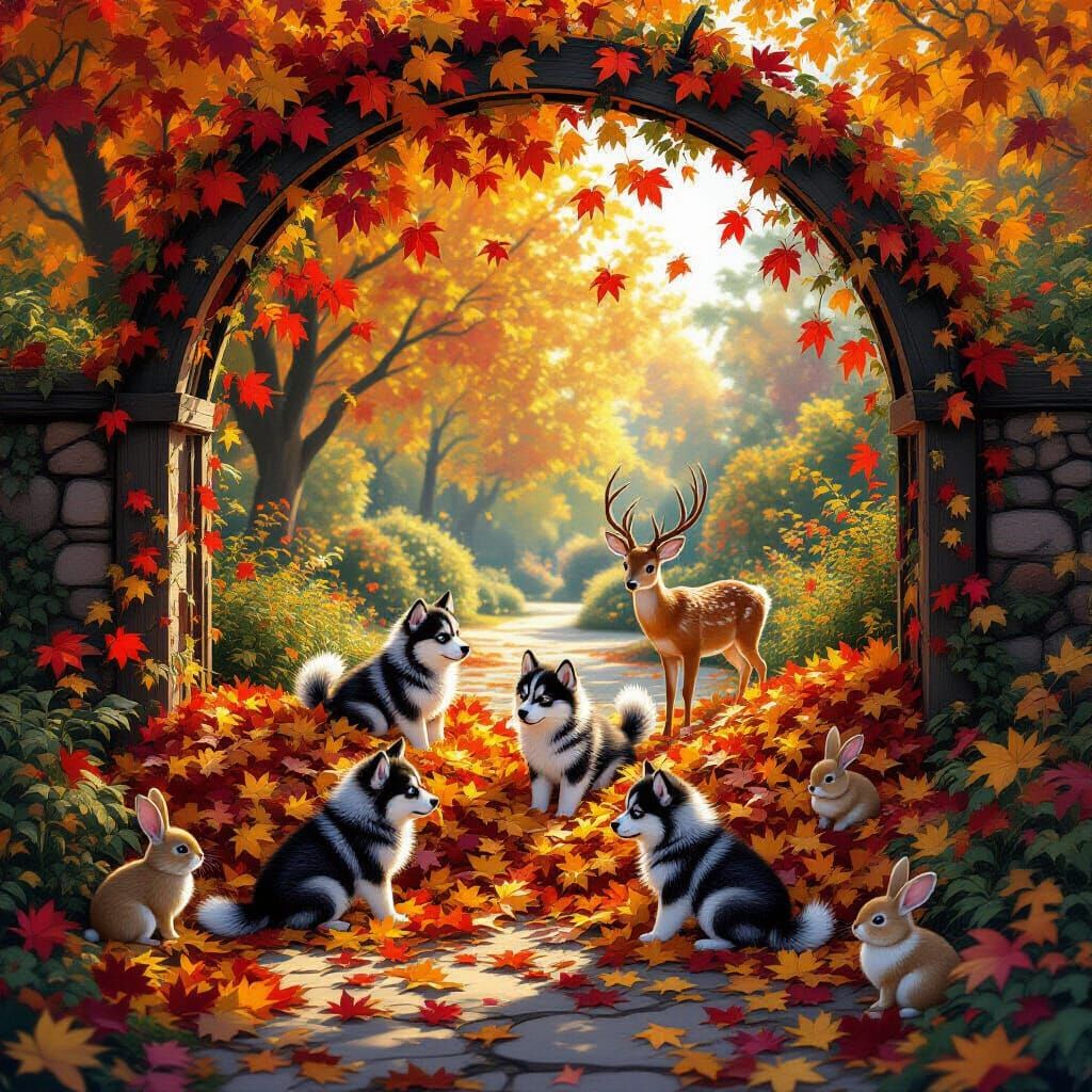 This concept art features a secret garden in autumn, with lush foliage and fallen leaves. Cute husky puppies, bunnies, and deer play together in a vibrant, hyperdetailed scene with dynamic lighting.