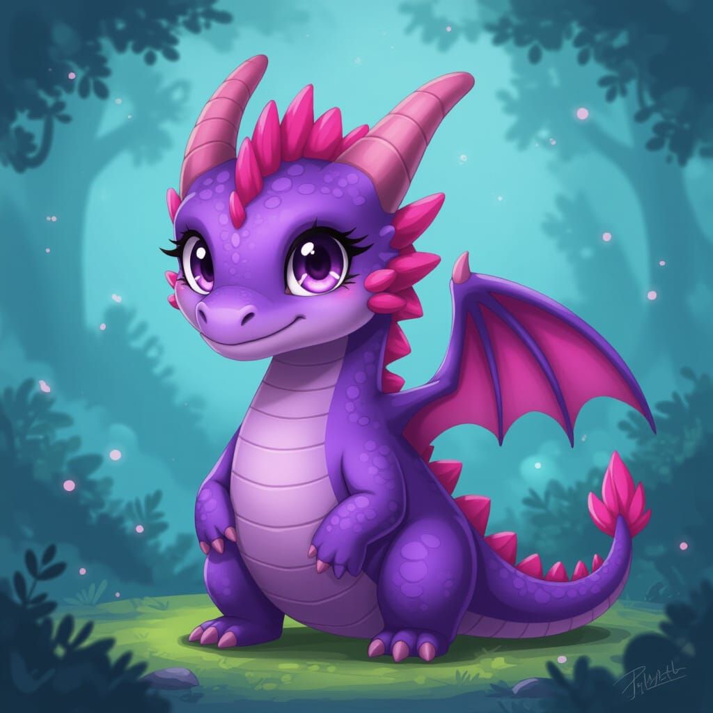 This image features a charming, small-scale rendition of a massive ancient purple dragon, presented in a delightful, cute fantasy art style.