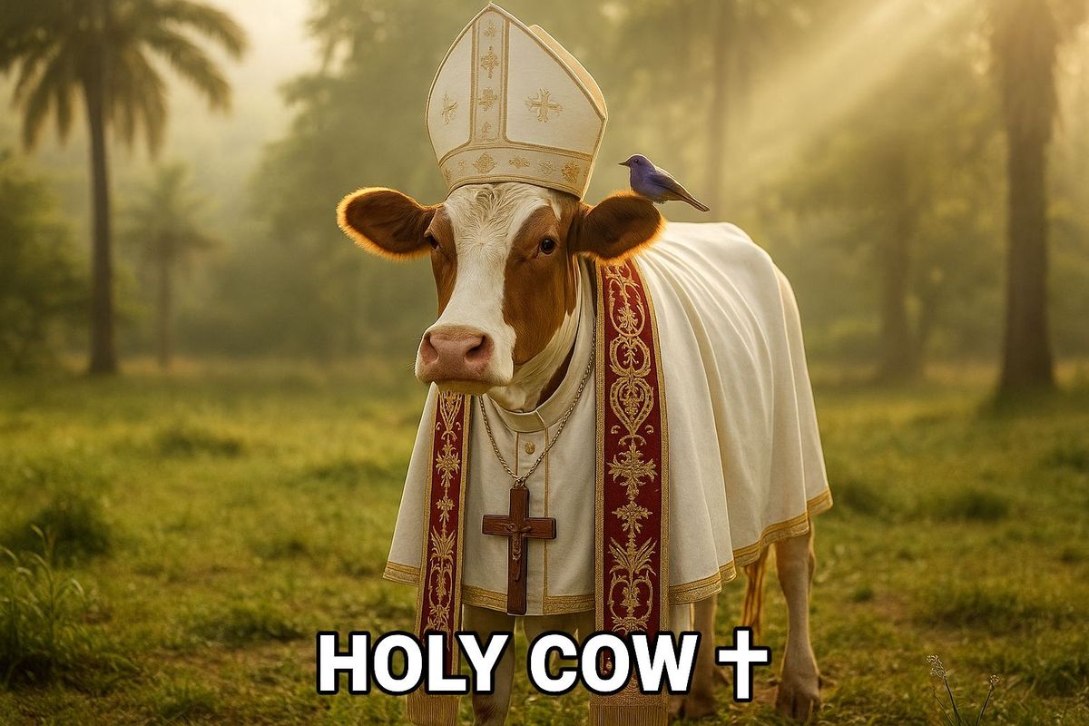 This image shows a cow dressed in papal regalia, including a mitre and crucifix, standing in a sunlit clearing. The photorealistic scene combines religious iconography with animal humor, enhanced by warm lighting.