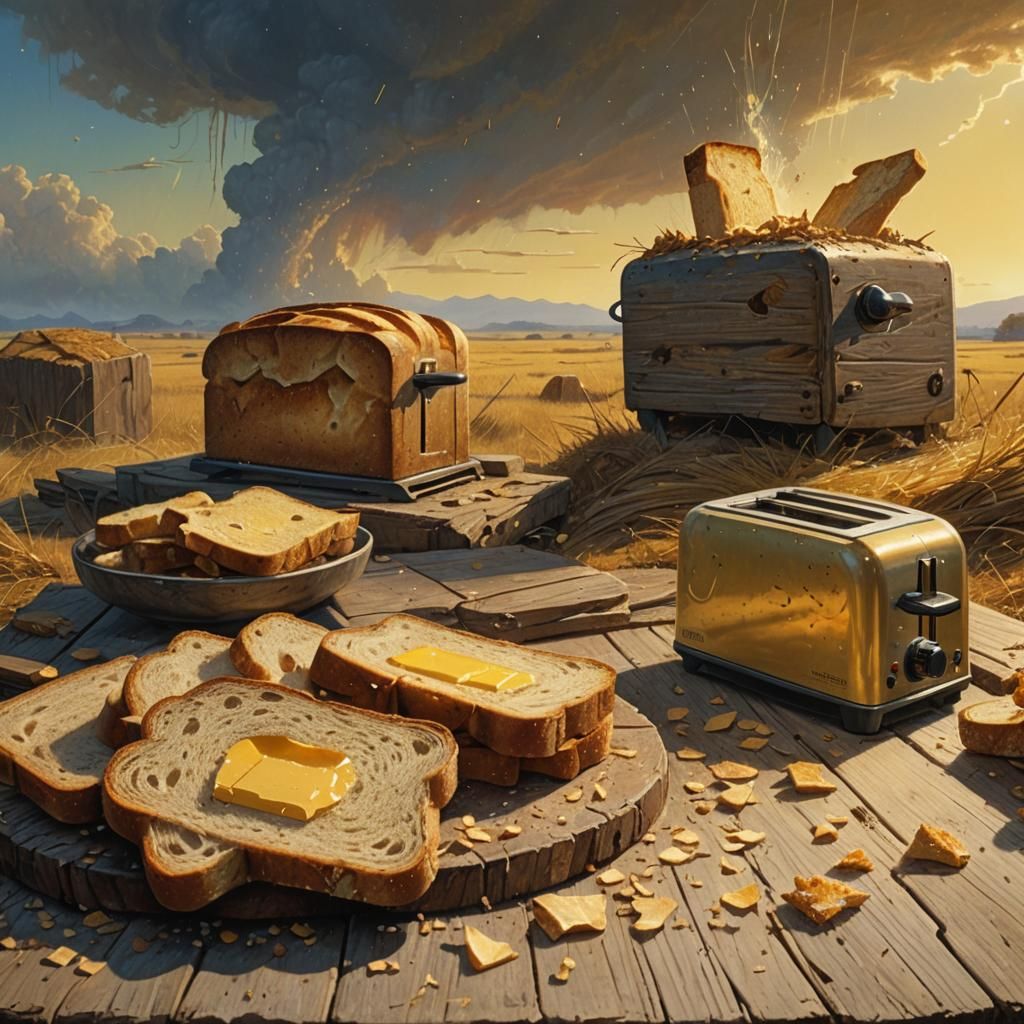 A hyperrealistic image showing toast, butter, and a toaster on a wooden counter, with fallen bread. Golden light illuminates crumbs in a richly detailed, cinematic scene with deep colors.