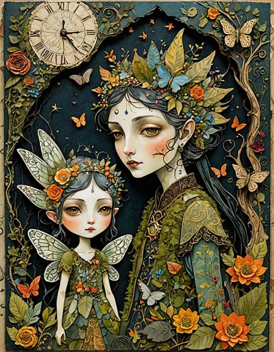 This image shows two characters with distinct faces, set against an ominous backdrop. It's a mixed-media illustration with layered textures, resembling an antique storybook page.
