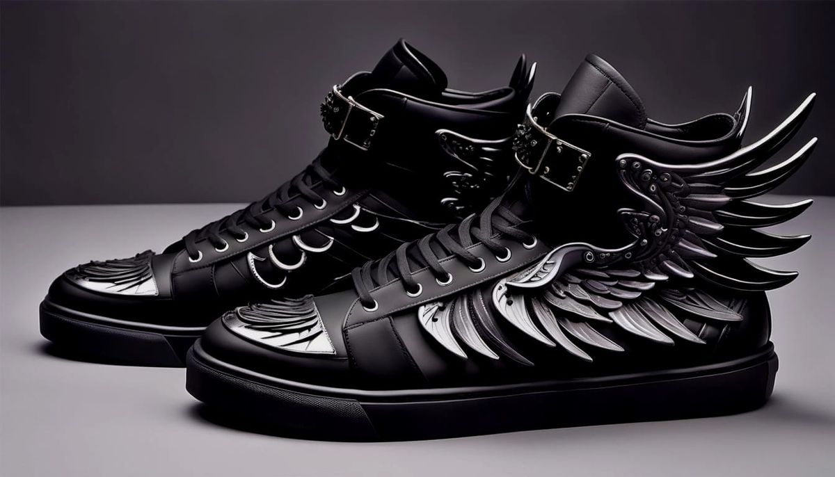 "Striking gothic high-top sneakers in deep matte black, adorned with sculpted black wings on each side, intricate lace patterns, metallic si...