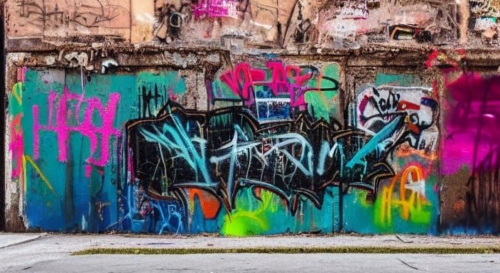 This image shows a defiant llama dressed in punk fashion, standing in a graffiti-filled alley with a broken neon sign. Features bold lines and desaturated colors with neon pops, inspired by street art masters.