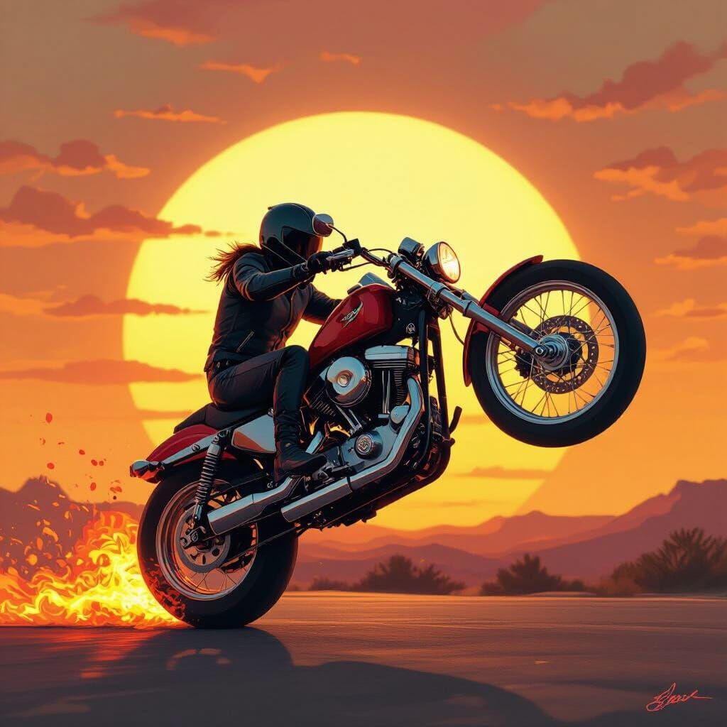 Easily create your own motorbike wheelie images with fire and sunsets using our free AI image generator. Unleash your creativity!