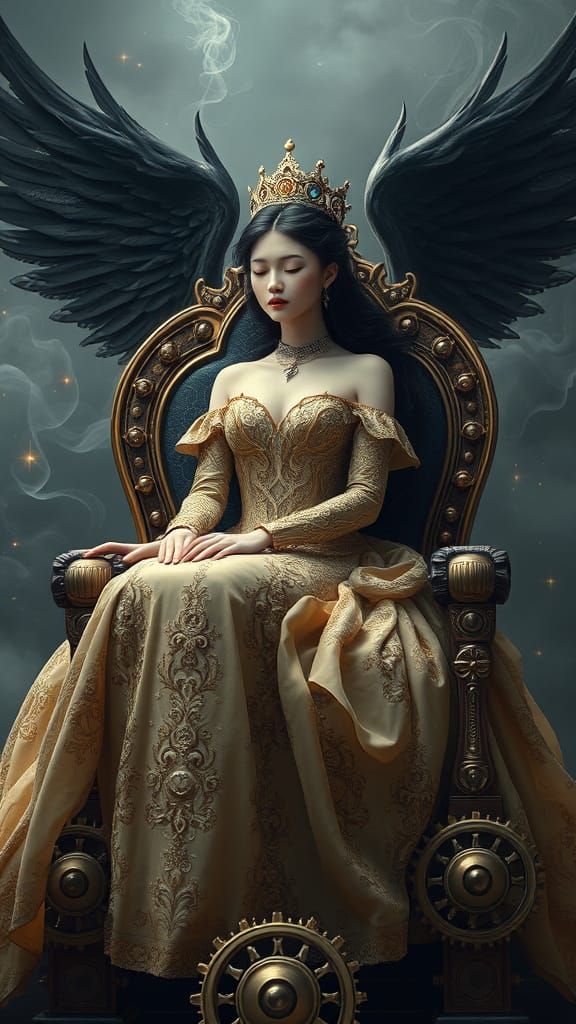 This image depicts a serene princess sitting on a throne made of intricate, ticking gears, surrounded by a mystical aura of wispy smoke. Her delicate skin and golden gown are rendered in photorealistic detail, evoking a sense of hyper-realism and wonder.