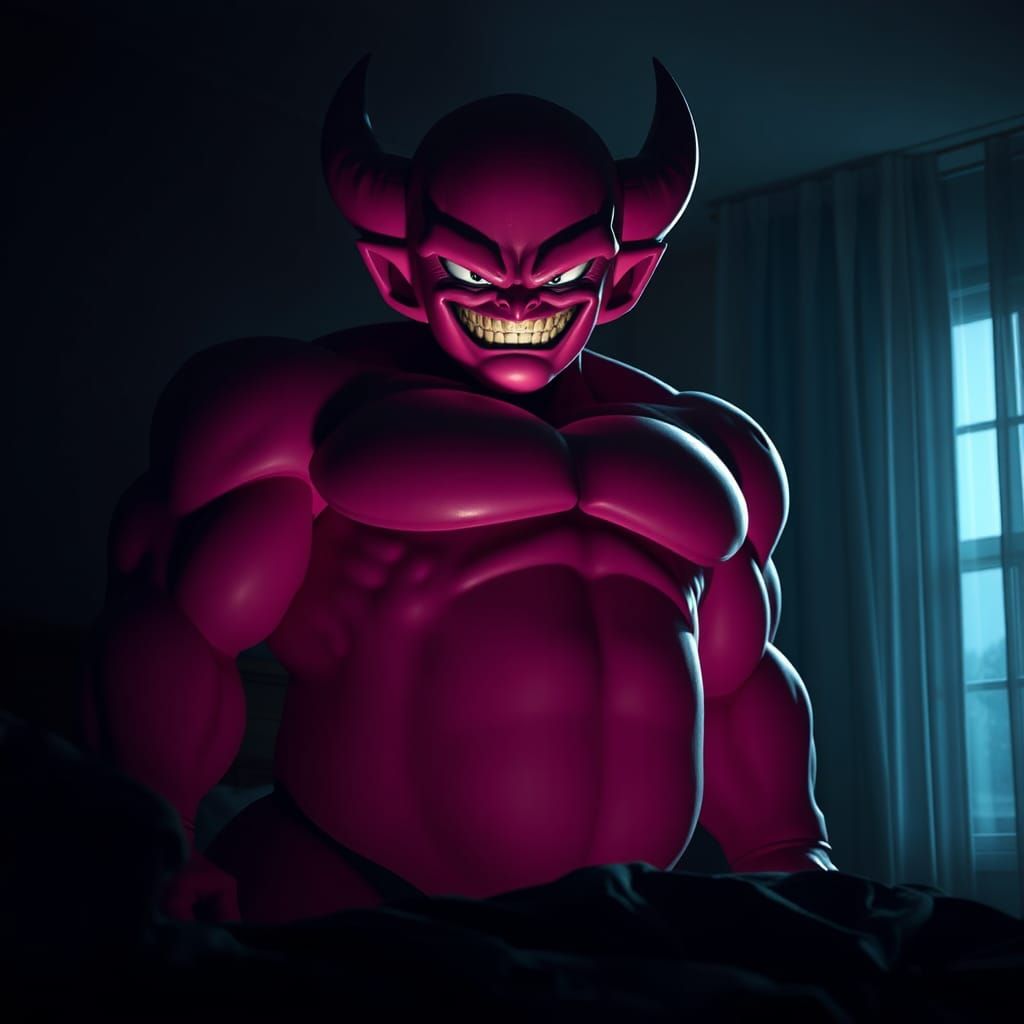 A chilling, photorealistic image of Super Buu in a dimly lit bedroom. The composition evokes a sense of dread with its cinematic, high-contrast aesthetic and eerie, atmospheric lighting. Buu's unnerving grin pierces the viewer.