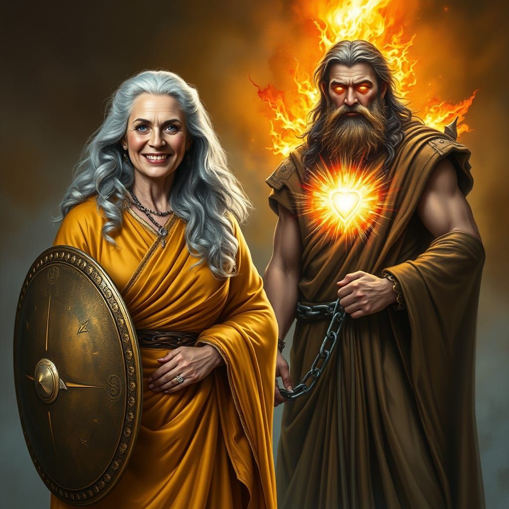 A dramatic fantasy art illustration depicting a smiling elderly woman in a golden robe holding a shield, standing beside a chained man whose eyes, mouth, and heart emit rainbow light. Rendered with intense lighting and vibrant colors.