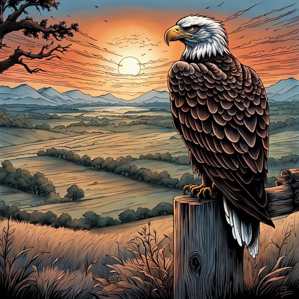 This image showcases a detailed ink illustration of a majestic eagle overlooking a countryside at sunset. The artwork features intricate linework and cross-hatching, capturing a powerful and peaceful scene.