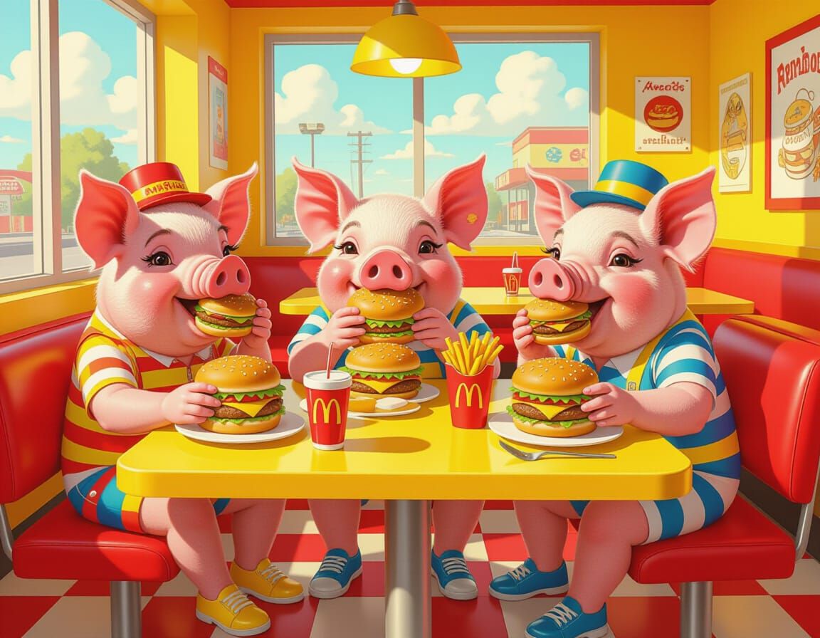 This image shows cheerful pigs enjoying hamburgers in a cartoonish restaurant setting. The playful scene features bold lines, vibrant colors, and exaggerated features, creating a whimsical atmosphere.