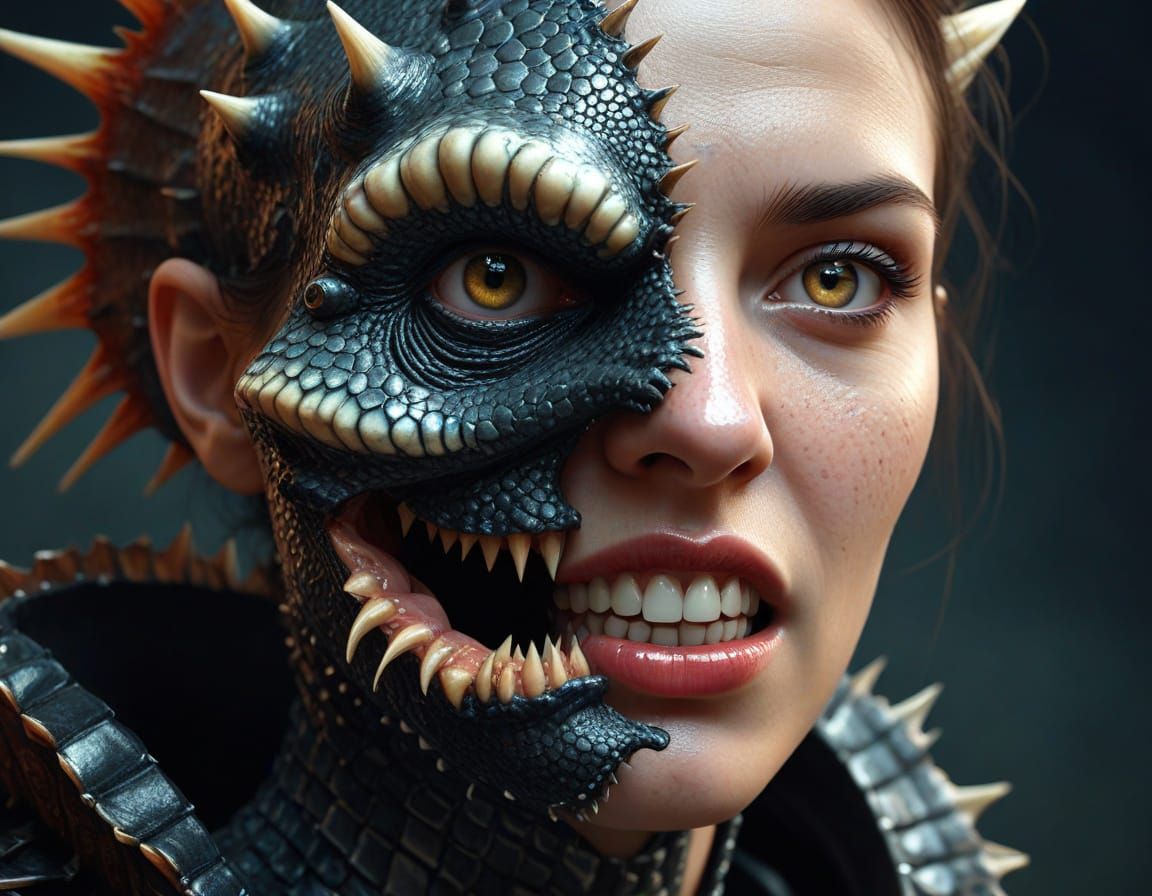 This digital painting showcases a close-up of an avantgarde woman with reptile skin, anglerfish teeth, and a Terminator-inspired face. Glowing zombie eyes and peeling skin add to the dark, horror-filled aesthetic, set against a backdrop of intense contrasts and vivid textures.