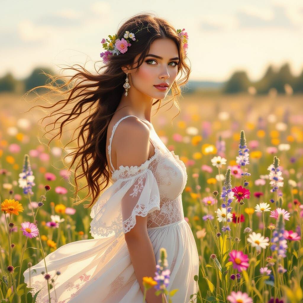 This image shows a beautiful woman in a wildflower field, bathed in golden sunlight. The artwork evokes Art Nouveau with soft focus and pastel colors.