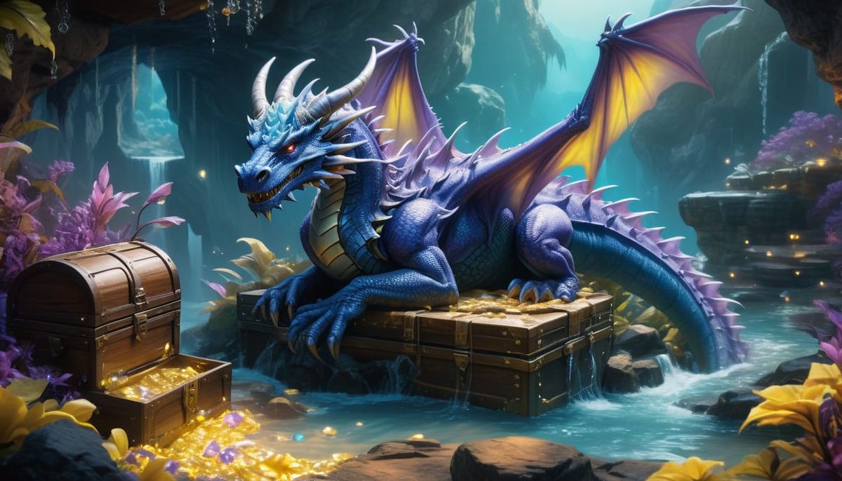 This image shows a spectral dragon asleep in a cave, guarding a treasure chest. The artwork is rendered in a soft watercolor style, with glowing crystals and gold treasure, illuminated by dynamic lighting.