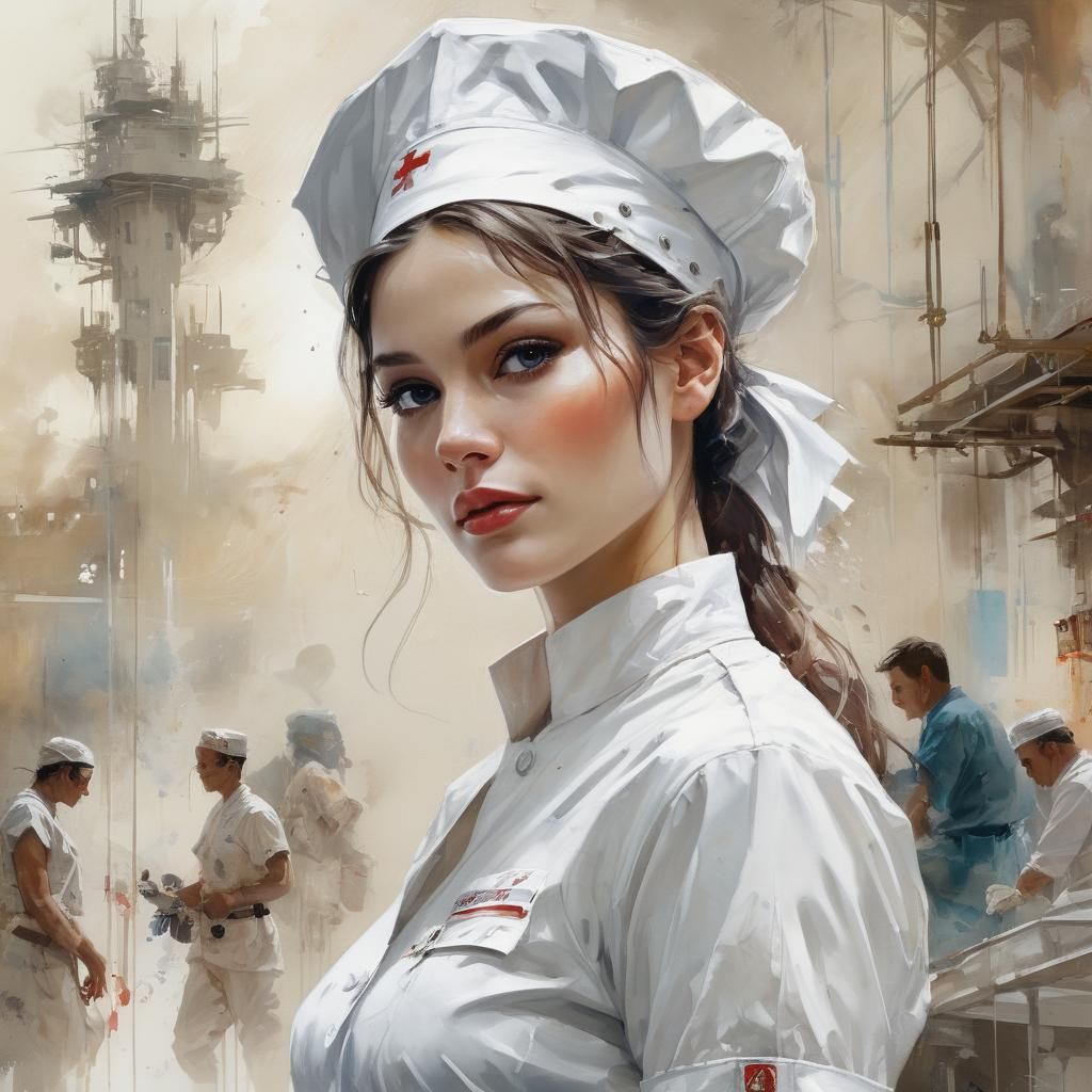 Timescape Art by Willem Haenraets, Jeffrey Catherine Jones, Frank Frazetta, Michael Kaluta, Michael Hague, Carne Griffiths, Close up Digital watercolor Illustration of a Beautiful young woman nurse in white uniform, hospital ward in the background, Extremely beautiful, Perfect painting, Intricate, oil ...