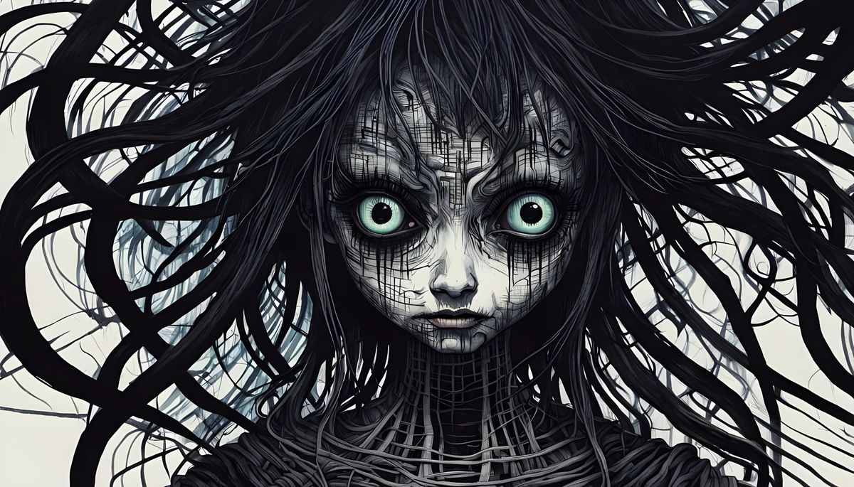 This image shows a spectral, glitching monster with distorted eyes, inspired by horror manga. Shadows and voodoo rituals pulse ominously in the dark.