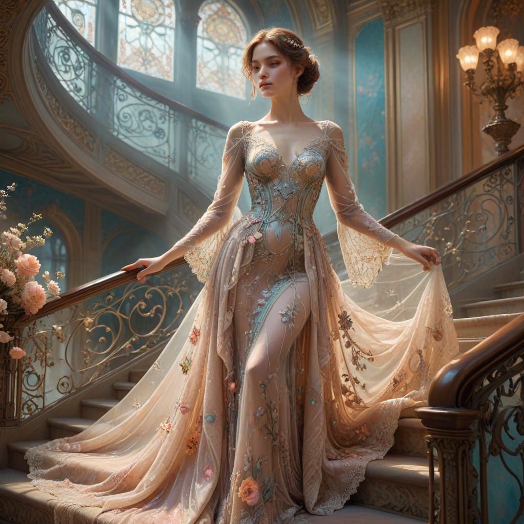 This digital painting depicts a woman in a luminous Dior haute couture gown with glowing floral patterns, posing gracefully on a grand ballroom staircase. Features an ethereal, romantic aesthetic.