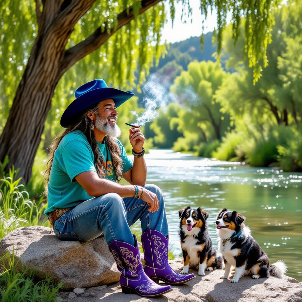 This image shows a shaman in cowboy boots and casual clothing laughing while sitting on a rock with dogs near a river. The serene landscape features cottonwood trees and red willow in earthy tones.